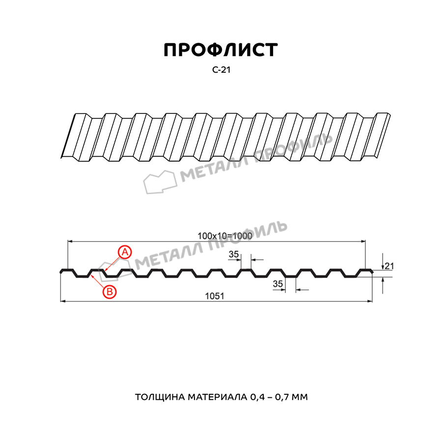 Профиль С-21 имеет толщину 0,5 мм, что обеспечивает надежность и долговечность конструкции. Он изготовлен из металла высокого качества, что делает его устойчивым к коррозии и воздействию внешних факторов.