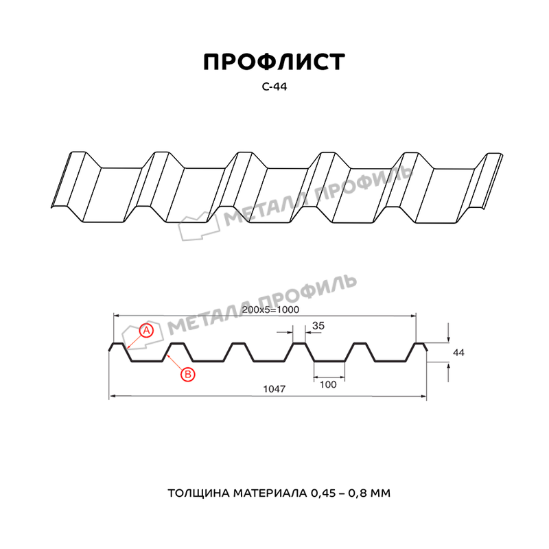 Профиль имеет форму С-44, которая обеспечивает прочность и устойчивость к нагрузкам. Он идеально подходит для использования на крышах, фасадах зданий, заборах и других объектах.